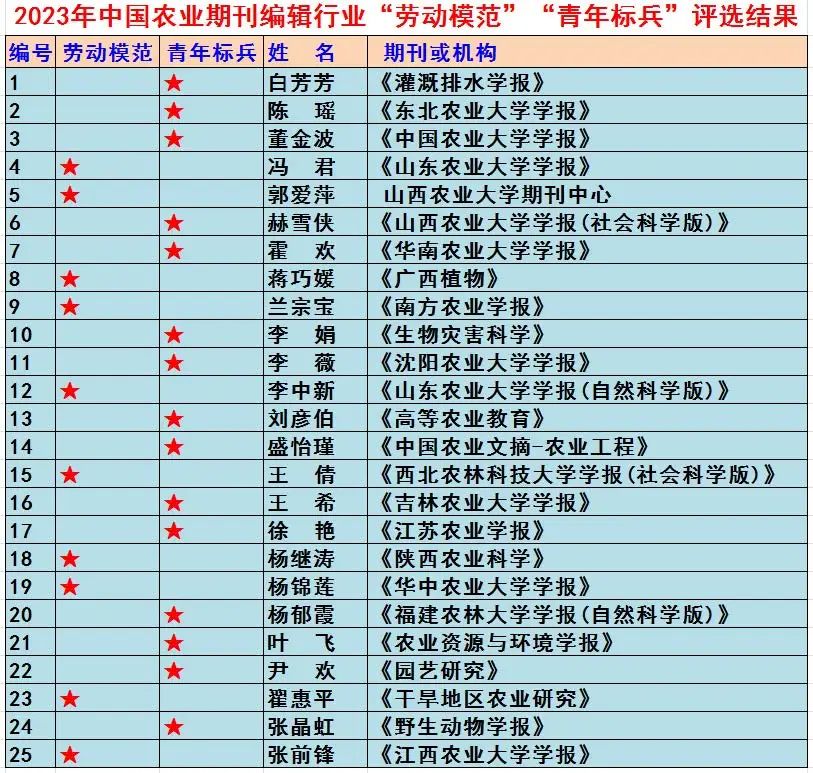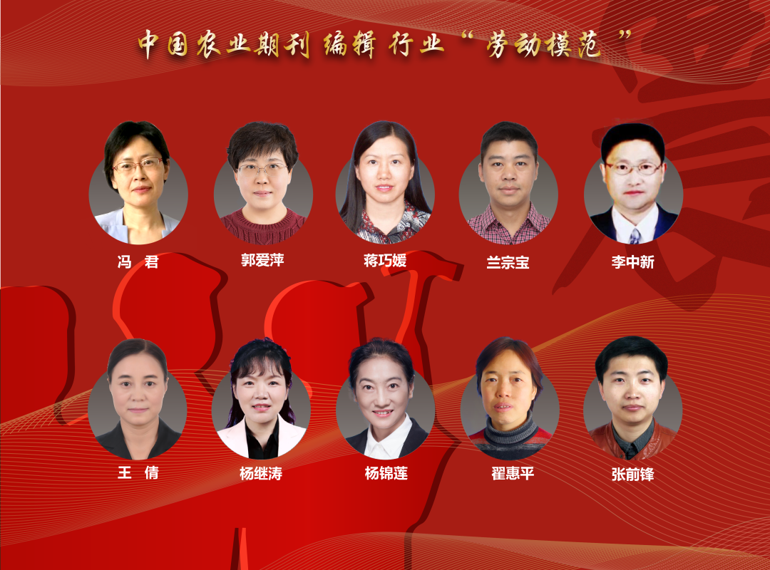 “劳动模范”是一个光荣的称号,淡泊名利、甘为他人做嫁衣是编辑工匠精神的集中体现。同时,传承“五四精神”,争做时代标兵已成为青年编辑勇于创新、追求卓越的崇高目标。根据“2023 年中国农业期刊行业“三八”红旗手暨“五一”劳动模范、“五四”青年标兵评选方案”,中国农业期刊网编辑委员会组织全体主任委员对各位候选人的业绩材料进行了认真审查及投票表决,评选结果经公示及编委会研究决定,评选出中国农业期刊行业“劳动模范” 10 位、“青年标兵”15 位。中国农业期刊网编辑委员会倡议广大农业期刊编辑同仁向“劳动模范”学习,向“青年标兵”看齐,资深编辑继续发挥榜样作用,青年编辑奋笔书写青春华章,共同为中国农业期刊的繁荣发展不懈努力!